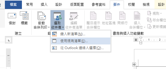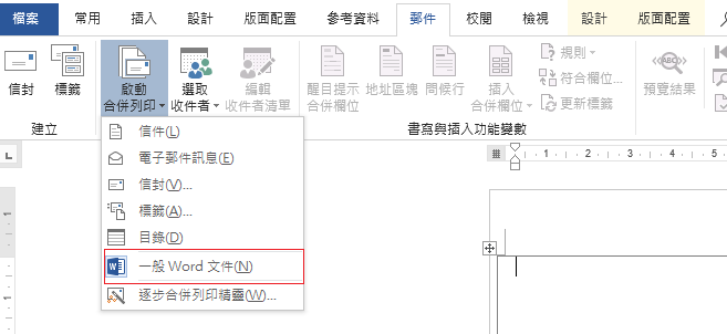 之後開啟郵件 => 合併列印 => 一般Word文件